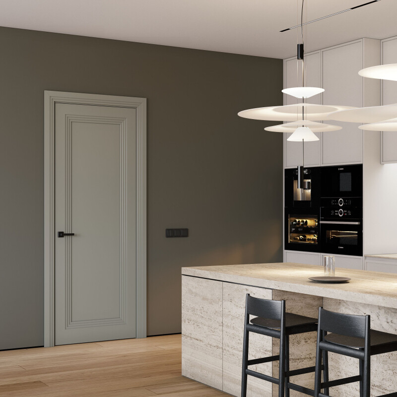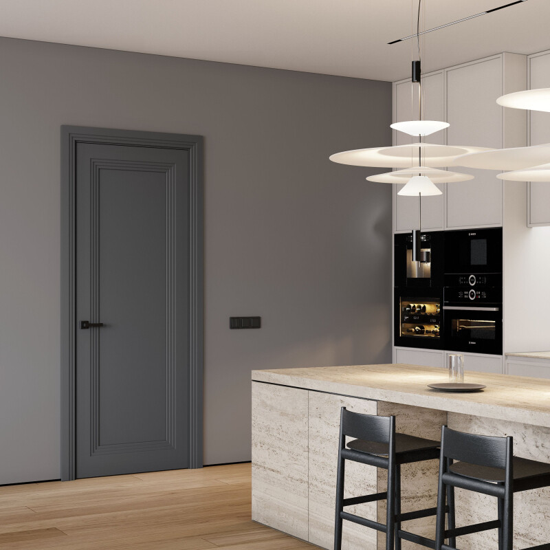 Современный дизайн: граничащая между модерном и неоклассикой межкомнатная дверь Левел 1 украшена глубокой ступенчатой фрезеровкой, которая будет эффектно смотреться в любом интерьере.