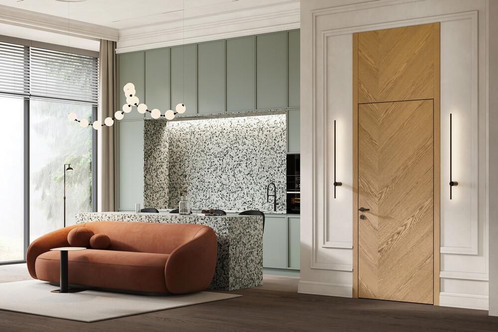 Это наличник, который образует единую плоскость с дверным полотном. Такое решение создаёт стильный минималистичный дизайн. В то же время обеспечивается экономия пространства, так как с наружной стороны дверь можно открыть полностью. Наружный наличник-компланар представляет собой накладную планку Г-образной формы, где короткая сторона соприкасается с торцом дверного полотна, а длинная прилегает к стене. С внутренней стороны дверей можно использовать телескопические наличники.